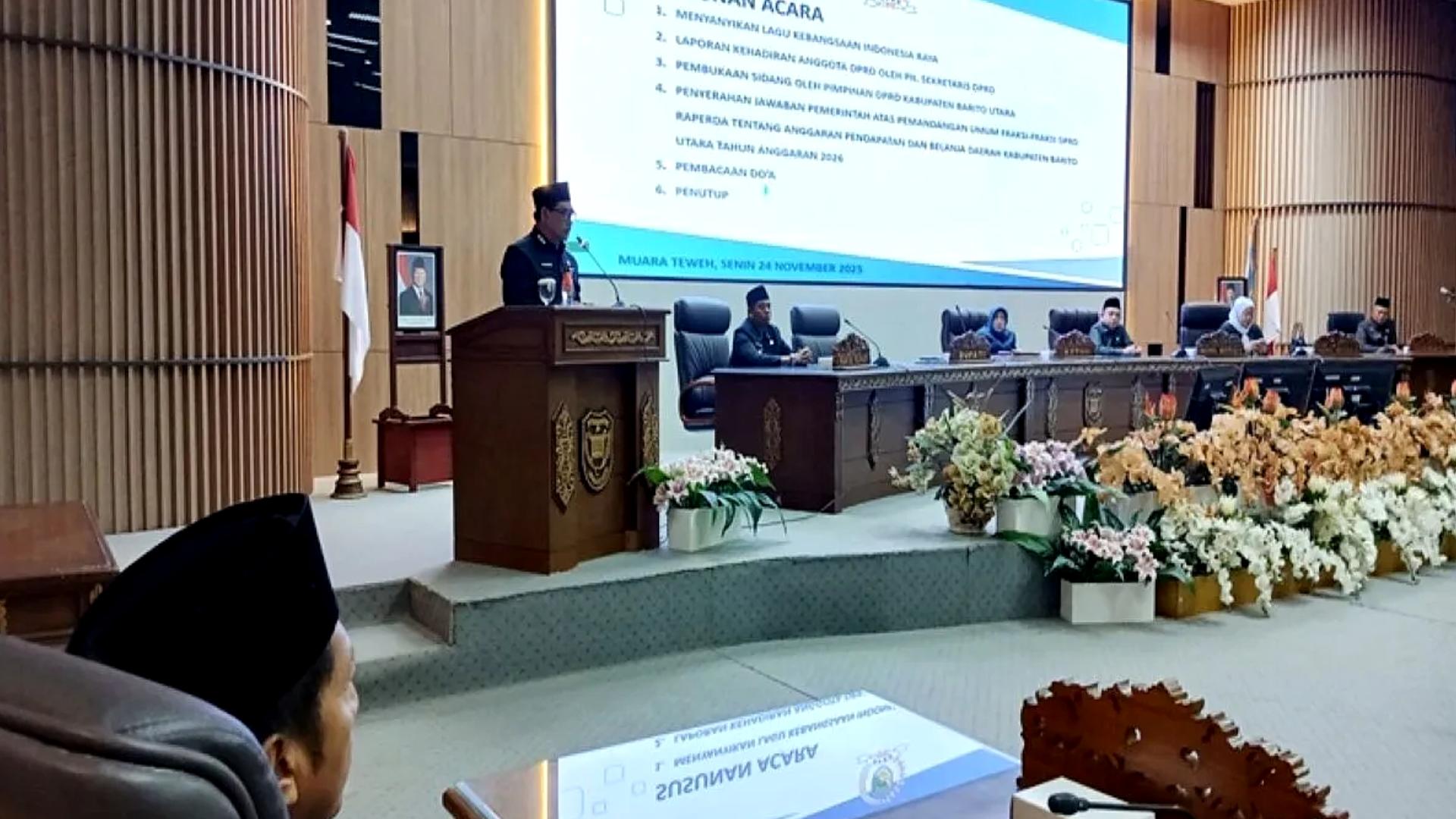 MUARA TEWEH, BERITAKALTENG24.COM – Bupati Barito Utara, Shalahuddin, menekankan pentingnya masukan dari fraksi-fraksi DPRD dalam penyusunan Anggaran Pendapatan dan Belanja Daerah (APBD) Tahun Anggaran 2026. Hal ini disampaikannya saat rapat paripurna jawaban pemerintah atas pemandangan umum fraksi, Senin (24/11/2025).