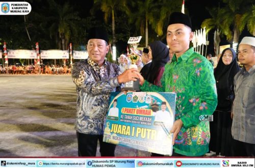 Bupati Murung Raya Heriyus menyerahkan trofi juara umum kepada Camat Murung, Ivan Sugita, sekaligus menyampaikan apresiasi kepada seluruh masyarakat yang berpartisipasi. “STQ ini menjadi wahana penting dalam memacu pengembangan tilawah, hafalan, serta pendalaman isi kandungan Al-Quran, khususnya bagi generasi muda,” ujar Heriyus didampingi Wakil Bupati Rahmanto Muhidin.